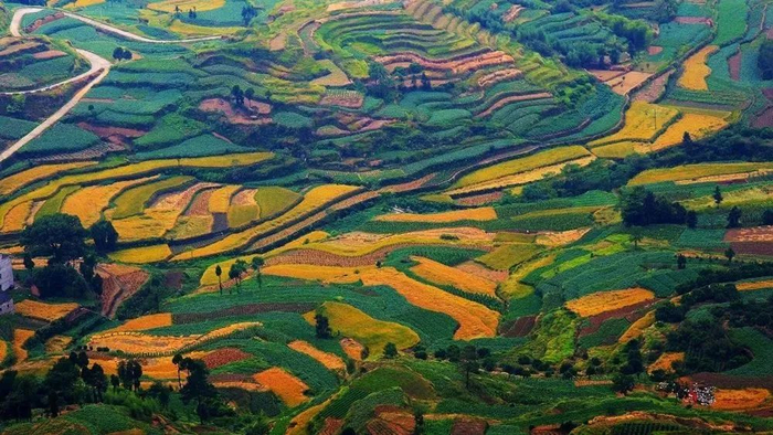大片的橘红、金黄在山林间蔓延开来……