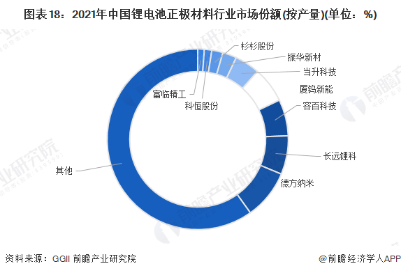 从产量来看,2021年,中国锂电池正极材料行业市场份额排名前三的企业分别是德方纳米、长远锂科与容百科技,市场份额分别为8.84%,6.91%与6.52%。