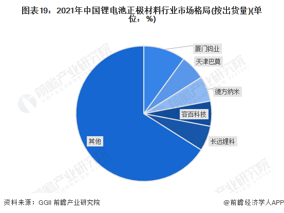 按出货量来看,2021年,中国锂电池正极材料行业市场份额排名前三的企业分别是厦门钨业、天津巴莫与德方纳米,厦门钨业市场份额为10%,天津巴莫与德方纳米均为6%。