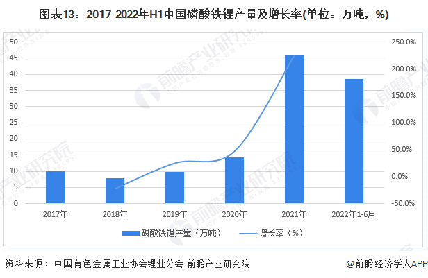 磷酸铁锂材料凭借其安全性能好、比容量大、高温特性好、循环性能优异、无毒无污染等特性,成为锂电池正极材料行业未来主要的发展方向之一。2017-2021年,中国磷酸铁锂产量呈现增长的状态,并在2021年达到了45.91万吨的产量,创造了新高,同比增长了223.3%。2022年1-6月,中国磷酸铁锂产量为38.47万吨。