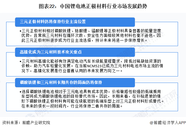 根据近年来锂电池技术的发展及在全球范围内的广泛应用情况来看,锂电池正极材料未来将主要以三元材料的主流位置、高镍化以及多种材料共存的方向发展。