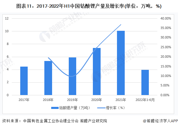 钴酸锂由于具备倍率性能强、工作电压高、压实密度较高等优势,主要应用于3C电子领域。2017-2021年,钴酸锂产量持续增长,年均增长率达到了23.9%。2021年,中国钴酸锂产量10.1万吨,达到新高。2022年1-6月,中国钴酸锂产量为3.96万吨。