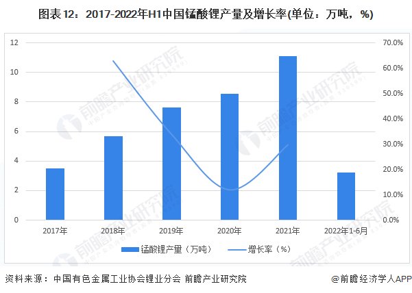 2017-2021年,我国锰酸锂产量整体呈现增长的趋势,年均增长率为28.4%。2021年产量为11.11万吨,达到新高,同比增长29.8%。2022年1-6月,中国锰酸锂产量为3.21万吨。