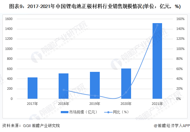 根据中国锂电池正极材料行业各细分产品出货量与各细分产品均价来计算,2017-2021年,中国锂电池正极材料行业销售规模持续上升。2021年,我国锂电池正极材料销售规模达到1516亿元,同比增长147.71%。