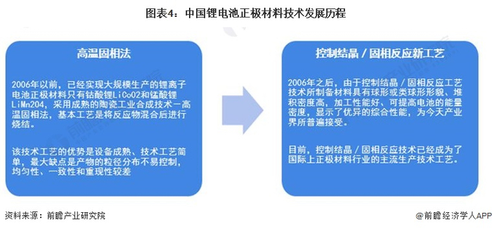 从锂电池正极材料的制作技术上来看,2006年以前,中国主要采用高温相固法进行正极材料的大规模生产,2006年之后,中国研制出了控制结晶/固相反应工艺,以控制结晶制备前驱体为技术核心,从4个层面对材料结构的性能进行优化,目前,该技术已经成为了国际上正极材料行业的主流生产技术工艺。
