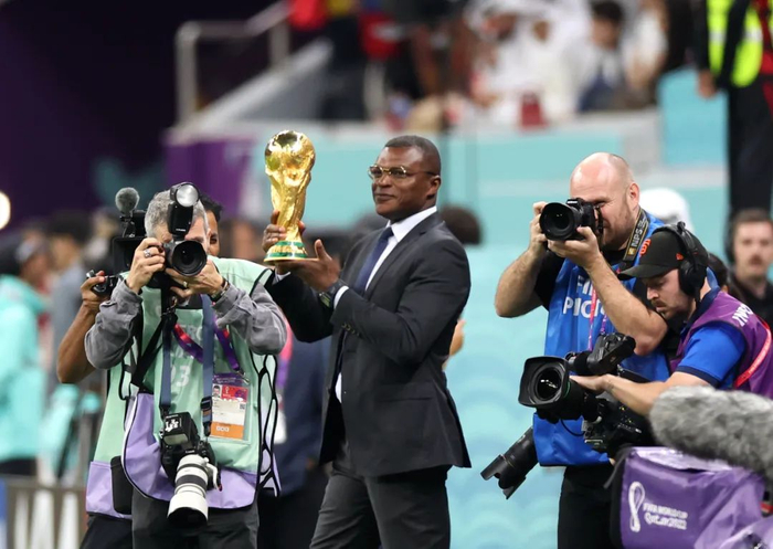 11月20日,法国队名宿德塞利(中)将大力神杯带入海湾球场。新华社记者 李明 摄
