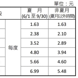 一般家庭由于用电量较少且低谷时段(22:30-07:30)用电量不多,故多采用阶梯电价计费。以夏月为例,假设每月用电433度,其中的120度每度电价为1.63元新台币(与非夏月单价一致),121度-330度部分对应每度2.38元新台币,剩余103度对应3.52元新台币,逐级增加。简言之,用电量越大、单价越高。