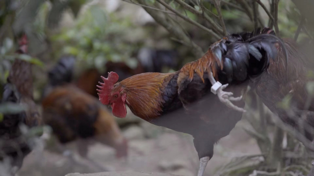 在唐平冬的养殖基地,一只只放养的土鸡遍布山林,自由地觅食,这就是唐平冬引以为傲的创业成果——“跑步鸡”。与平时所见的土鸡有所不同,每一只“跑步鸡”的脚上都戴了一个印有二维码的“智能溯源脚环”。
