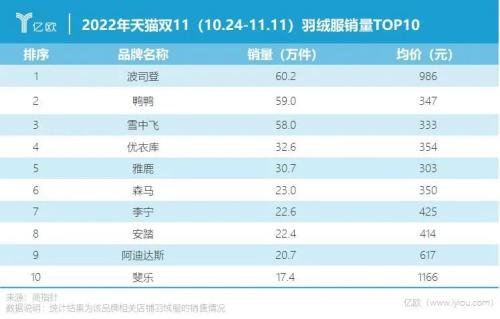 商指针数据显示,今年双11热销的羽绒服品牌均价也大多在500元以下。