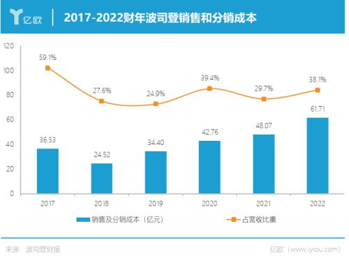 此前的2020财年和2021财年,波司登销售分销开支分别为42.76亿元和48.07亿元,占集团总营收分别为39.4%和29.7%。整体来看,波司登每年花在营销上的费用要占总营收的近4成。