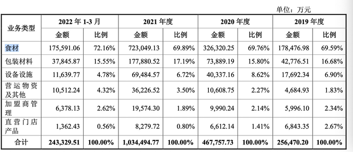 据蜜雪冰城招股书披露,公司食材类产品(也就是原料)的收入占比几乎是公司总营收的70%。2019年、2020年、2021年以及2022年第一季度,公司的食材类销售收入分别达到 17.85 亿元、32.63 亿元、72.30 亿 元、17.56 亿元,占公司当年主营业务收入的比例分别达到 69.59%、69.76%、 69.89%、72.16%。