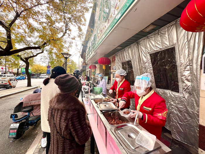 除了为市民提供点餐服务,这家老字号还承担着核酸检测点、疫情防控值守岗等防疫点位的应急供餐保障任务。“昨天晚上9点多接到通知,金融街街道附近的几个核酸检测点提供早餐和午餐,这不,今天凌晨4点多大家伙就上岗了。”店经理许世鹏说。“早餐6点前后出锅打包好,7点前送完,接着就开始忙活准备午饭了,最近每天几乎都要供应近千份餐食。”