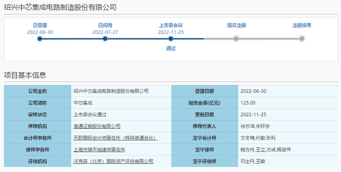 11月25日,绍兴中芯集成电路制造股份有限公司(简称“中芯集成”)首发通过上交所科创板上市委会议。此次IPO的保荐人为海通证券,拟募资125亿元。