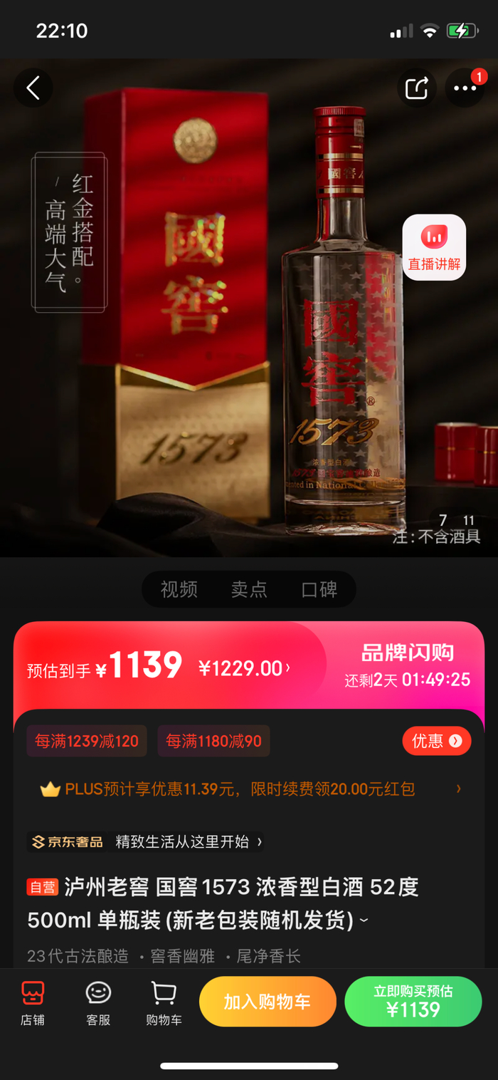 截至目前,派代在泸州老窖官方京东自营旗舰店搜索,52度500毫升国窖1573仍可下单购买,但双瓶装价格已经由1958元回升至2248元,每瓶约1124元,如果单瓶下单,预估到手价为1139元,略高于非京东自营店铺。