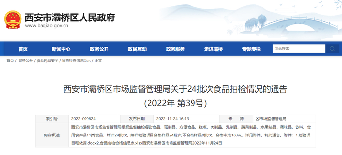 中国质量新闻网讯 据西安市灞桥区人民政府网站消息,2022年11月24日,西安市灞桥区市场监督管理局发布关于24批次食品抽检情况的通告(2022年 第39号)。
