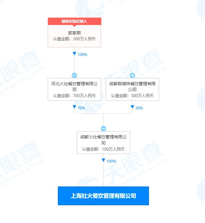 股东信息显示,上海社火餐饮管理有限公司由成都火社餐饮管理有限公司全资持股,疑似实际控制人为郭家熙。据悉,火社火锅品牌由邓伦和发小郭家熙共同创立。