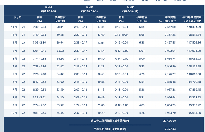 港交所统计,2022年7月至10月,大市日均成交额已连续4个月低于千亿港元,月总成交额也连续4个月低于两万亿港元大关。大市连续低迷之下,成交额排名前14的A组券商占比也由6月份的63.6%提升至10月的65.45%,而排名65名之后的C组券商占总数百分比也由6月的5.54%下降至10月的4.26%。两组数据的一升一跌,也意味着小型券商的生存空间持续被压缩。