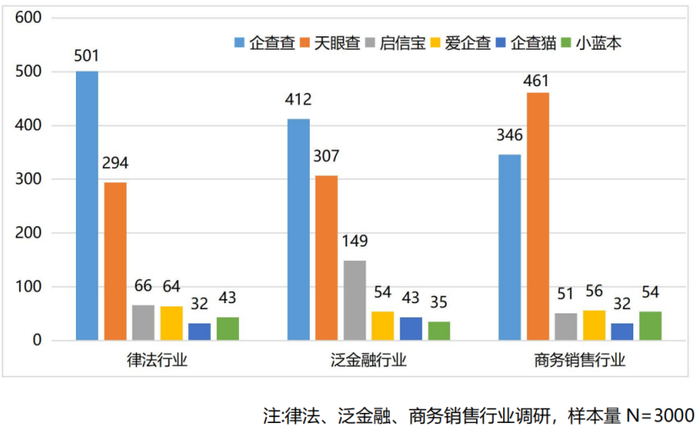 同时,目标客户上,企查查聚焦高净值专业用户,其中60%以上日活用户分布在一、二线城市,天眼查聚焦于下沉用户,60%以上活跃用户集中于二线及三、四线城市。在企业信用大数据应用渗透率方面,企查查在律师行业、泛金融行业的渗透率分别为50.1%、41.2%,保持行业领先地位,天眼查则在商务销售行业保持领先优势,渗透率达46.1%。