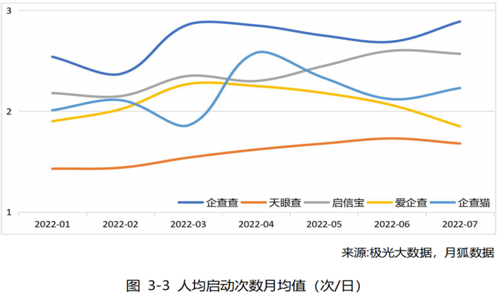 目前,企查类产品已成为社会信用查询领域的刚需,用户粘性稳步提高。在使用时长和人均日启动次数上,企查查人均使用时长为5.07分钟,人均日启动次数为2.67次,均高于行业一般水平,其次为启信宝、爱企查等。
