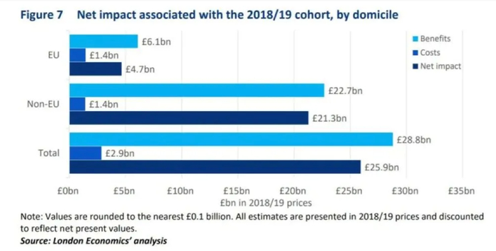 从“卖方”角度看,英国高校也需要留学生创收。由英国政府资助的罗素集团对外公布的数据,其旗下的学校,每招收一名本土学生,就会亏损1750英镑(英国政府规定每位本土学生的学费上限为9250英镑),甚至因为种种因素,到2024/2025学年,这种亏损甚至可能增加到4000英镑/人。