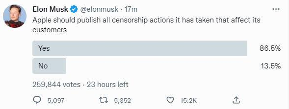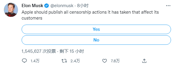 马斯克向他的1.19亿粉丝发起了一项民意调查,询问“苹果是否应该公布其采取的所有影响其客户的审查行动”。