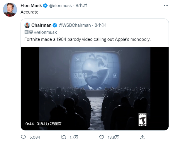 马斯克还明确表达了他对苹果垄断的看法。他回复推特用户援引的一条抨击苹果垄断的视频,说:“就是的”。