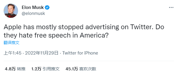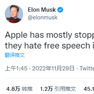 马斯克在一条推文中写道,苹果“已大部分停止在推特上投放广告”,并补充道:“他们讨厌美国的言论自由吗?”