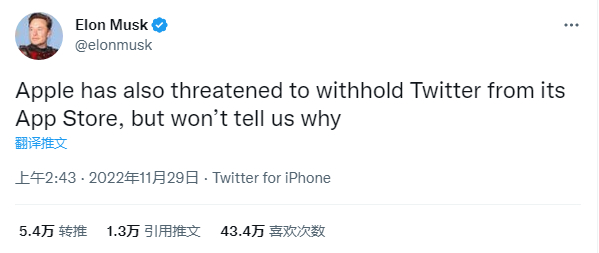 在另一条推文中,马斯克补充道:“苹果也威胁要将推特从其应用商店中撤下,但没有说明原因。”