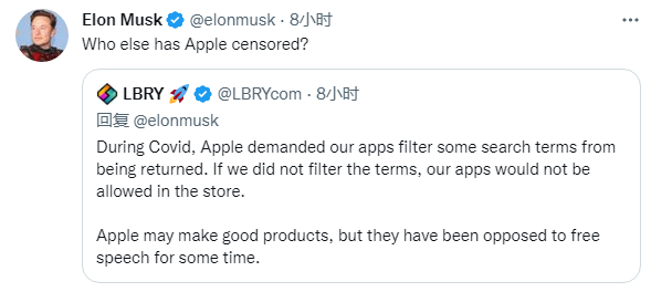 马斯克提到了批评苹果的人士的担忧,即苹果没有提供足够的信息,来说明为什么某些应用程序和内容会被App Store下架。他在推文中问道:“苹果还审查了谁?”