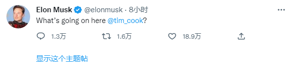 在另一条@了苹果首席执行官蒂姆·库克的推文中,马斯克问道:“这到底是怎么回事?”