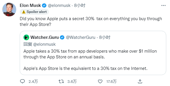 就在上周,马斯克在推特上抱怨了谷歌和苹果向推特等公司收取过高的应用商店费用。