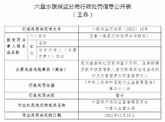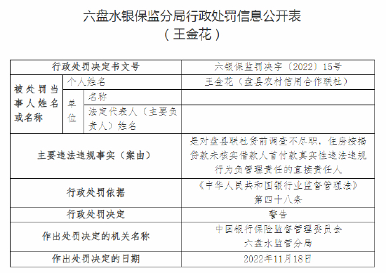 11月29日消息,据银保监会六盘水银保监分局行政处罚信息公开表显示,盘县农村信用合作联社因贷前调查不尽职、住房按揭贷款未核实借款人首付款真实性,被监管处以罚款二十五万元;此外,王金花、王春是对上述违法违规行为负管理责任的直接责任人,因此均被处以警告。