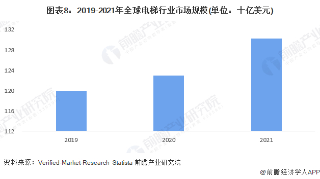 根据Statista和Verified-Market-Research共同发布的全球电梯行业市场规模数据,可以看到2020年的全球电梯行业市场规模约为1229.8亿美元,且未来将保持稳定增长,2021年全球电梯市场规模约为1302.1亿美元。