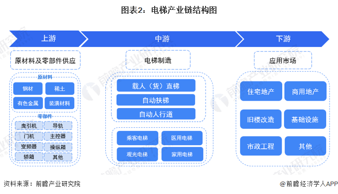 从电梯行业产业链上下游来看,电梯制造业的上游主要为基础原材料及电梯零部件制造业。电梯生产和制造最主要的原材料为钢材和稀土,钢材可用于生产电梯轿厢、轿架、轿门、厅门和上下梁等钣金加工件,稀土是电梯核心部件永磁同步曳引机中永磁体的主要原材料。