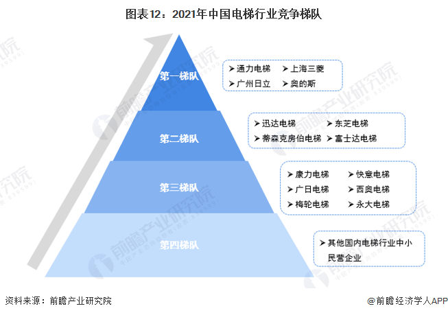 综合各品牌在中国市场的研发能力、产品质量、服务水平和顾客满意度等表现,中国电梯行业竞争企业可分为四个梯队,以通力、日立、三菱电梯以及奥的斯为代表的老牌外资电梯企业仍然领衔国内电梯市场,为第一梯队;迅达电梯、东芝电梯、蒂森电梯、富士达电梯等外资品牌的客户管理精细程度相对较弱,位于第二梯队;永大电梯、康力电梯、西奥电梯等本土电梯企业产品成为民族品牌电梯代表,发展势头强劲,位于第三梯队;其他国内电梯行业的中小企业位于第四梯队。