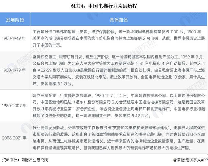 中国电梯行业相对于发达国家起步较晚,大致可以分为四个发展阶段。第一阶段二十世纪上半叶,我国电梯行业发展主要是对进口电梯进行销售、安装维护保养等;第二阶段是1950-1979年,我国坚持独立自主、艰苦研制开发生产国产电梯设备;第三阶段是1980-2007年,伴随着中国国产电梯技术逐渐趋于成熟,以及房地产开发行业快速发展,电梯行业进入快速发展阶段;第四阶段是2008年至今,行业进入高速发展,目前我国成为世界最大的新装电梯市场和最大的电梯生产国。