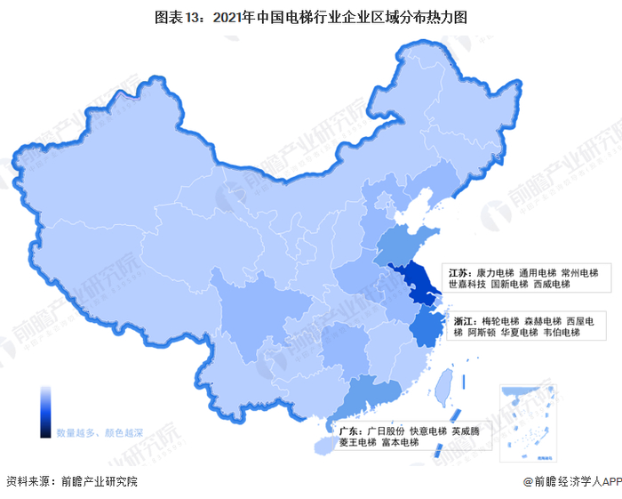 从电梯供给主体区域分布来看,中国电梯制造企业主要分布在江苏省、浙江省和广东省,其中江苏省的代表企业有康力电梯、西威电梯、通用电梯等;浙江省电梯制造代表企业有梅轮电梯、森赫电梯、西屋电梯等;广东省电梯制造代表企业主要有广东菱电、中富电梯、菱王电梯、永日电梯等。