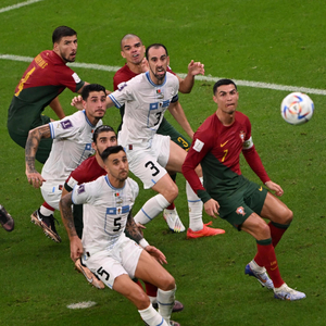 ▲北京时间11月29日,H组比赛中葡萄牙对阵乌拉圭,双方球员在比赛中争顶任意球。图/新华社
