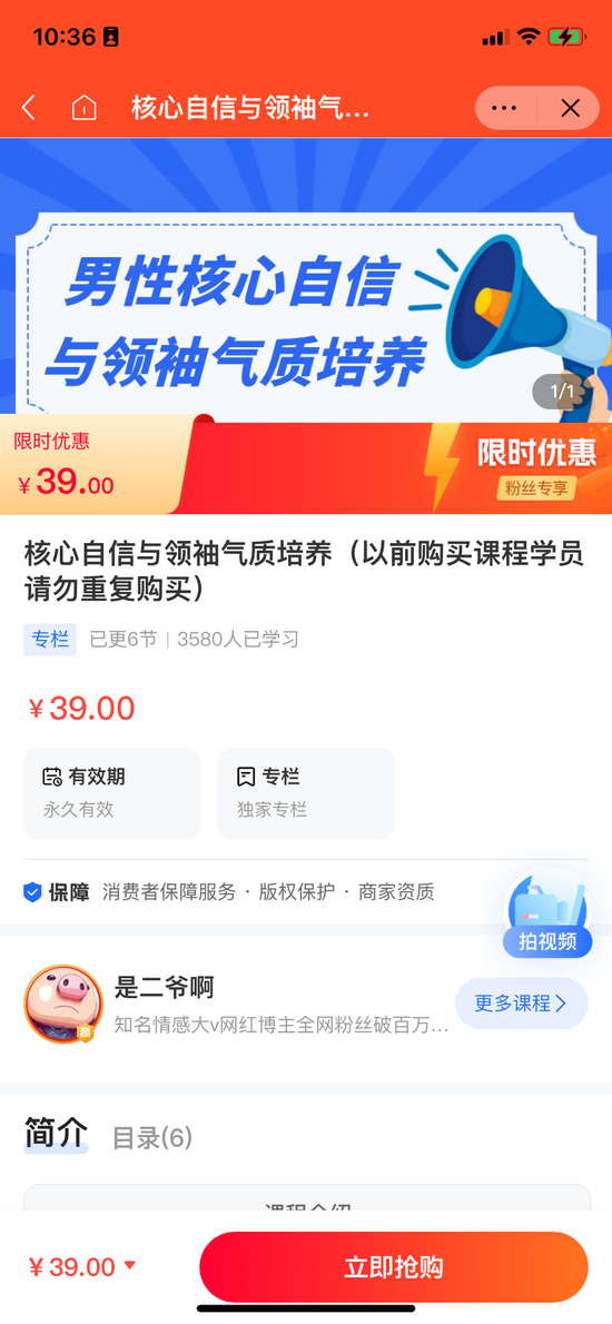 二爷主要是靠售卖情感课程、情感咨询服务和一对一私教课赚钱。他在抖音上的情感课程定价39元,包含七节课,主要给自己的高价咨询引流。