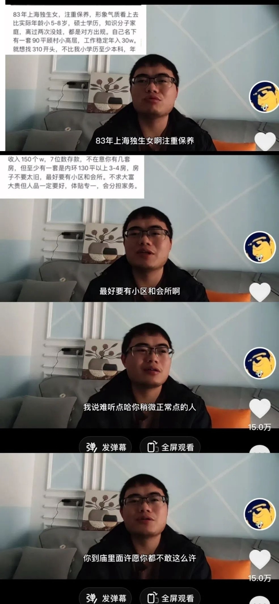 在拍了两年相亲类型的短视频后,2021年初,李雷开始发布一些评论性质的口播视频,从对婚姻、爱情的感悟,到对社会热点事件的剖析,再到分析网友的择偶要求,只要是和感情、婚恋有关的,都能被他拿来当做创作的素材。
