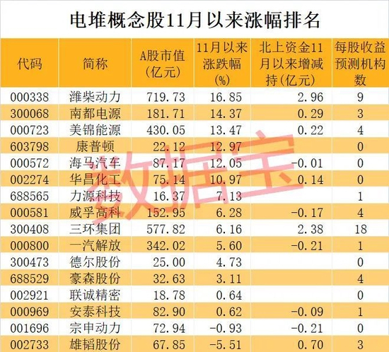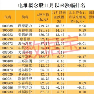 数据宝统计,截至最新,电堆概念股11月以来平均涨6.78%;潍柴动力、南都电源、美锦能源、康普顿、海马汽车、华昌化工等涨幅超10%。最新收盘价较年内高点相比,逾六成概念股回撤幅度超30%。力源科技回撤最为明显,该股于今年8月份创下年内高点,迄今回撤46.3%。