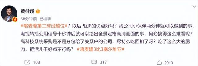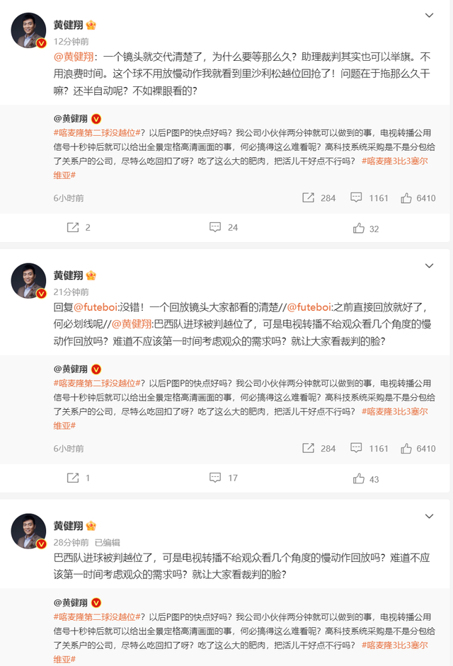 对此,黄健翔连续发文质疑:巴西队进球被判越位了,可是电视转播不给观众看几个角度的慢动作回放吗?难道不应该第一时间考虑观众的需求吗?就让大家看裁判的脸?