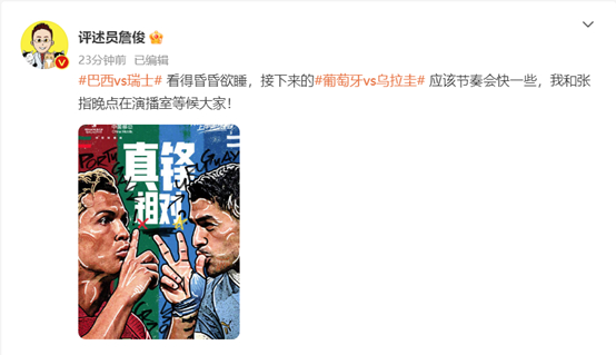 赛中,评述员詹俊发文称,这场比赛看得他昏昏欲睡。