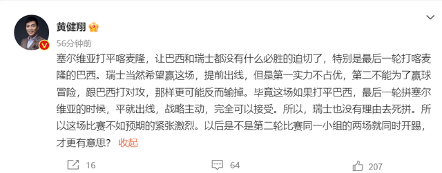 此前,黄健翔还表示,因为塞尔维亚打平喀麦隆,让巴西和瑞士都没有什么必胜的迫切了,特别是最后一轮打喀麦隆的巴西。