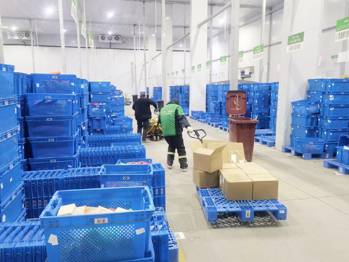 分拣员的工作强度是最大的。他们需要将经过理货、包装完毕的蔬果通过手动液压车拉到大仓内分布的120个前置仓货品暂存点,晚班分拣员再接过“接力棒”装货发车,每天往返上百次,不间断补货。记者看到,小伙子们每趟运送的货品都足够分量,每个托盘轻一点的三四百斤,重的上千斤。“虽然辛苦,但想到老百姓能吃到新鲜的蔬菜,心里还是挺高兴的。”郭伟说。
