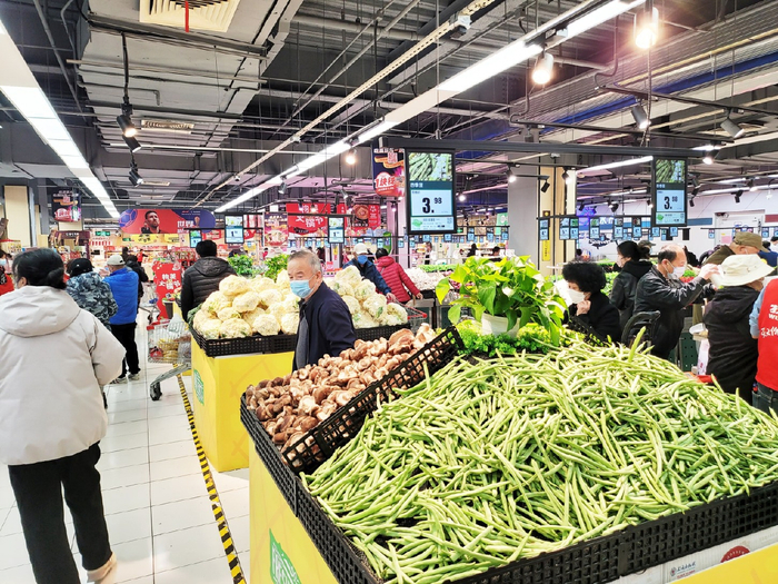 “新一轮疫情发生后,线上订单激增,骑手运力不足,很多居民直接来超市购买,这几天店里的人明显多了。”通州北京ONE地下一层的京东七鲜超市也增加了备货量,店长王世明介绍,“生鲜备货量增加了3倍左右,基础粮油也增加了2倍备货,目前消费者对生鲜需求相对较大,但整体节奏可控。”