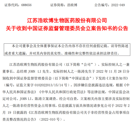 浩欧博公告披露,11月28日,公司及实际控制人之一兼董事长、总经理JOHN LI、实际控制人之一陈涛分别收到中国证监会下发的《立案告知书》,中国证监会决定对公司、JOHN LI、陈涛立案调查。