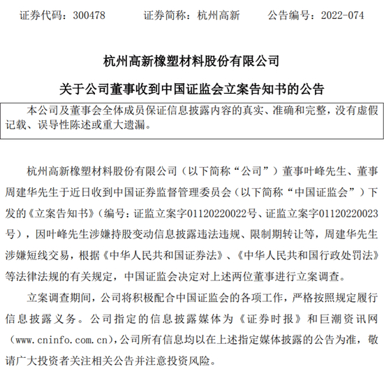 11月28日晚最新的公告中,杭州高新表示公司董事叶峰、周建华收到中国证监会的《立案告知书》。叶峰涉嫌持股变动信息披露违法违规、限制期转让等,而周建华涉嫌短线交易。根据法律法规的有关规定,中国证监会决定对上述两位董事进行立案调查。