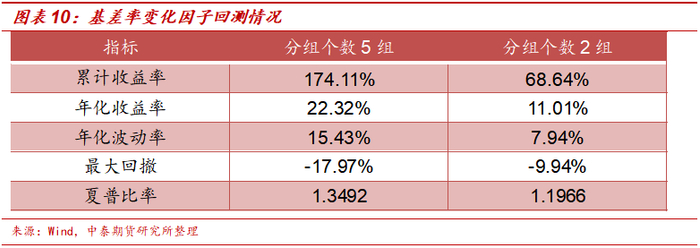 根据图表7至图表9的结果可知,当分组个数为2组时,该因子的效果依旧十分显著。图表10总结了当分组为5组和2组时该因子的多空组合回测结果。