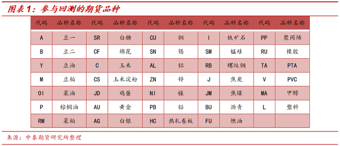 首先,根据本报告第二部分的方法计算因子数据(包括基差率以及基差率的变化),同时获取并整理回测期内图表1中期货品种的主力连续合约收盘价格数据。